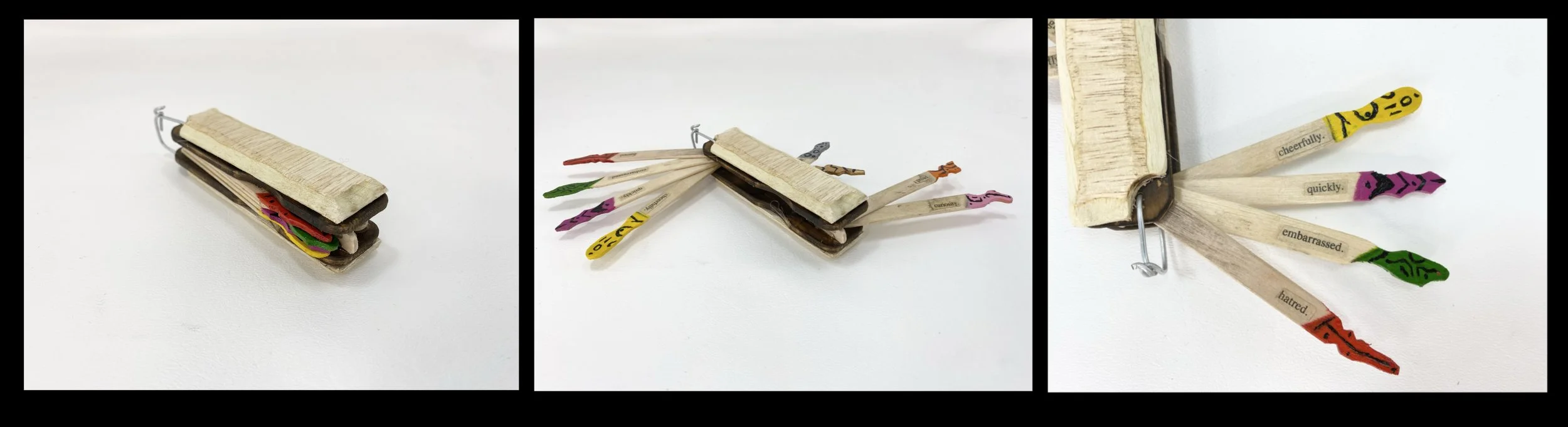 A multi-tool with implements that represent different reactions in conversation. This is designed to represent the difficulty someone with social issues may face when speaking, where they struggle to muster a reaction.