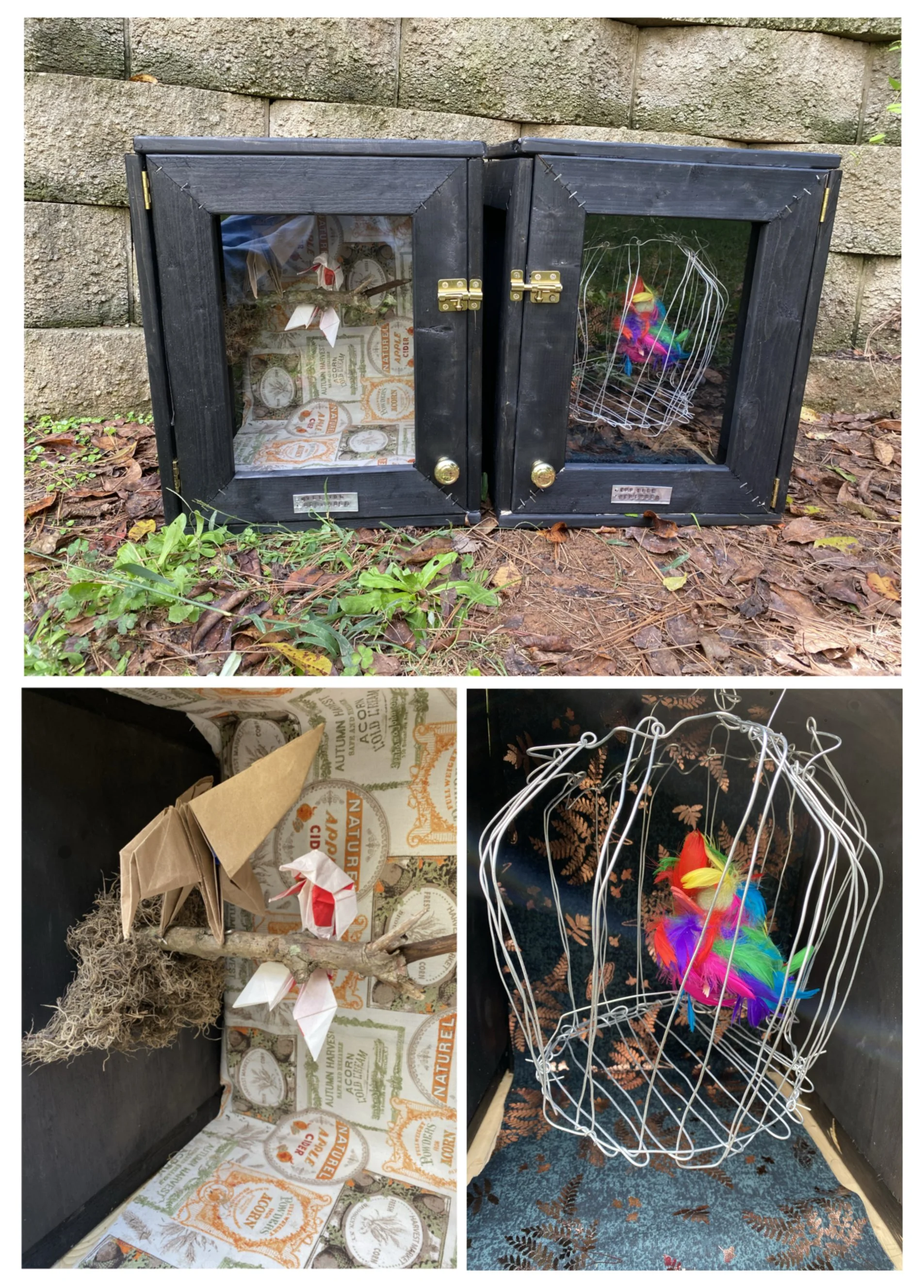 Medium: Homemade Cabinets, Origami Birds, Found Materials